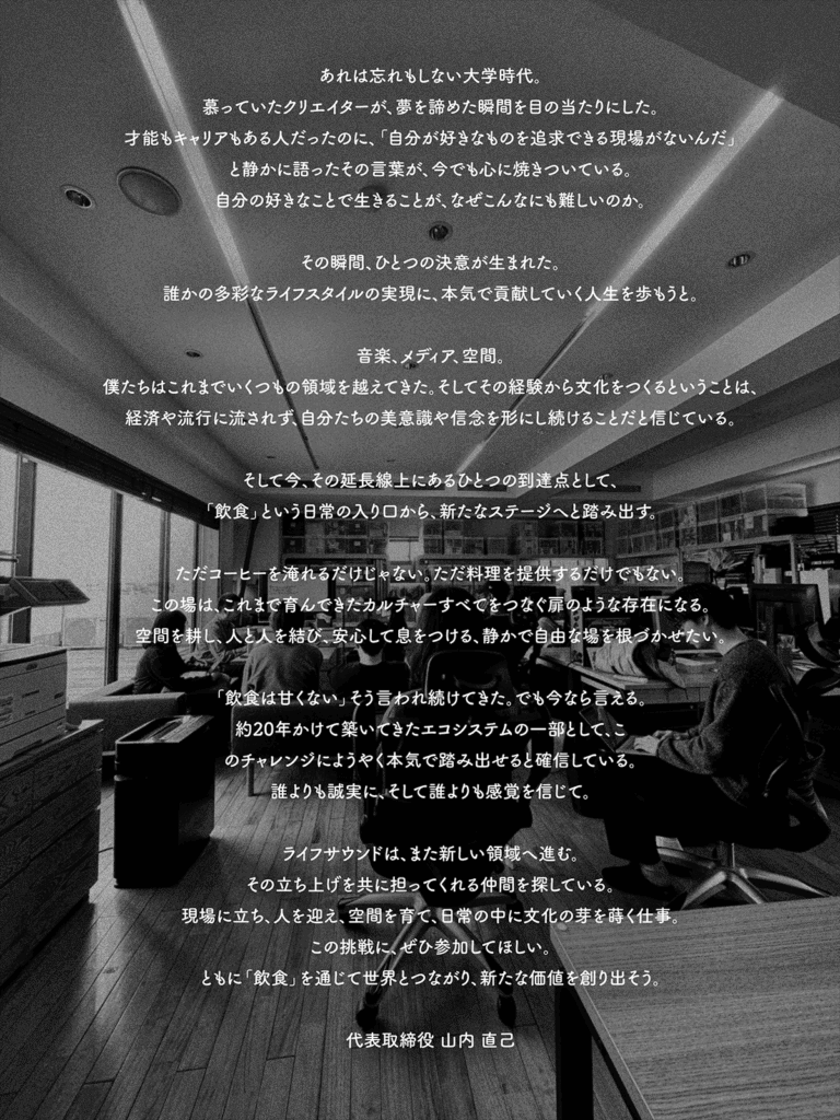 この新しい飲食プロジェクトの立ち上げにあたり、この場の中心を担ってくれる、大切なメンバーを募集します。僕らはこのポジションを「コミュニティマネジャー」と呼んでいます。それは、ただ店舗をマネジメントするだけでなく、僕たちが手がけている音楽やクリエイティブの領域、地域とのつながり、世界と交差するカルチャーの中に深く入り込み、それらすべてを“人を通じて繋ぐ”存在になってほしいという願いを込めているからです。